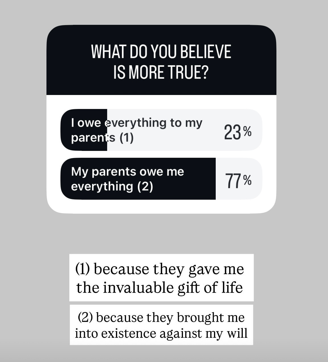 Because I find it so perplexing that some people seem to view life as a gift, I did what any serious philosophers would and made an Instagram poll: