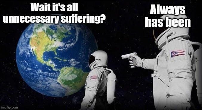 If we all agree that suffering is inevitable, and even the most optimistic among us admit that (worth noting that this isn’t a new thought: buddhists have believed life is suffering for millennia), then why keep subjecting new people to it? Isn’t the ultimate form of freedom, compassion - and maybe, controversially, of intelligence - deciding to opt out?